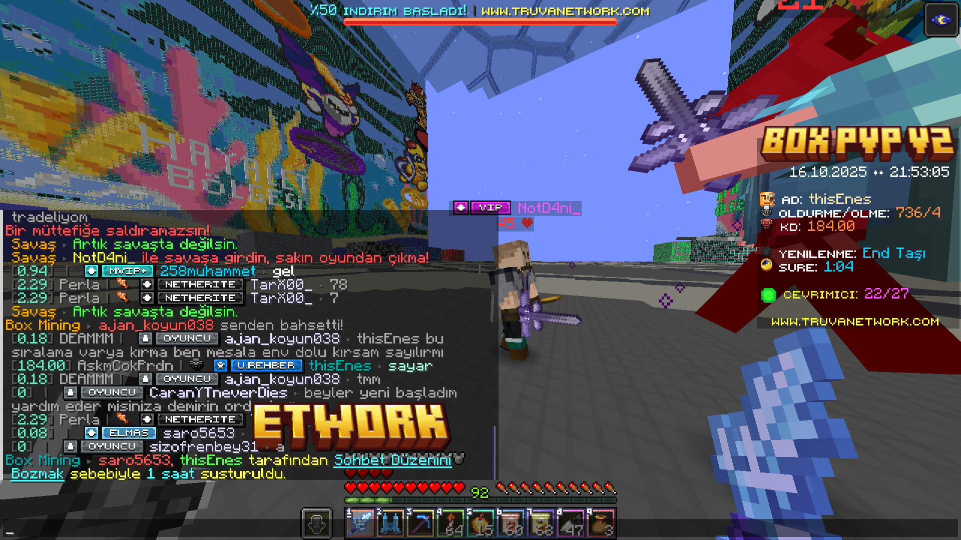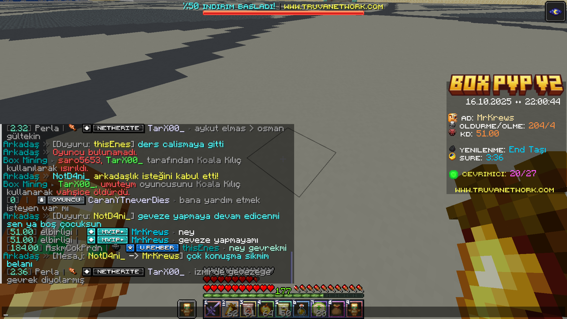 TruvaNetwork, Aralık 2023 tarihinde açılmış gelişmiş bir Minecraft sunucusudur. Adil ve Tecrübeli yetkili kadrosuyla beraber oyuncularına en iyi hizmeti sunmayı amaçlamaktadır. Vergi Kimlik No: 4940371468 BÜYÜKÇEKMECE Vergi Dairesi
